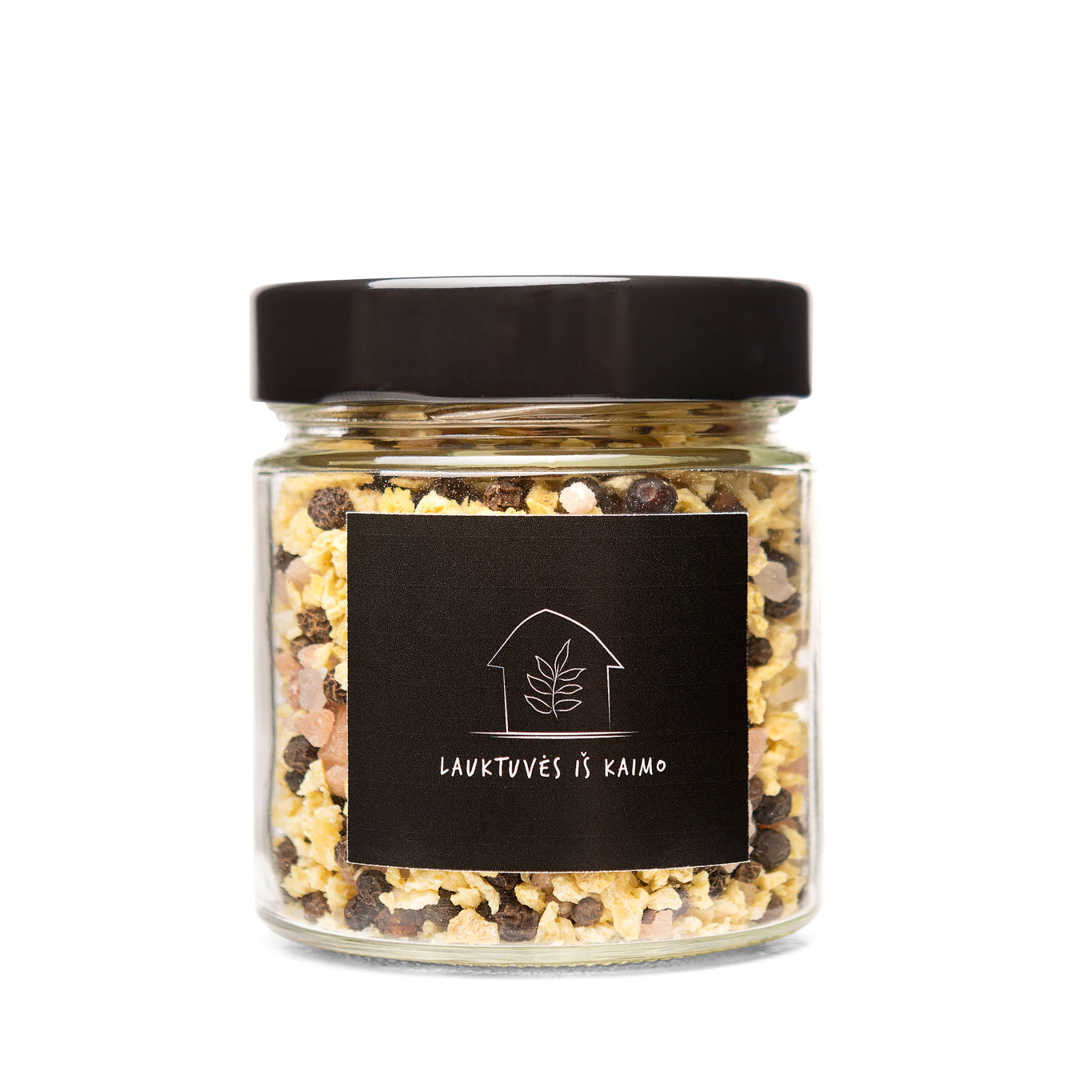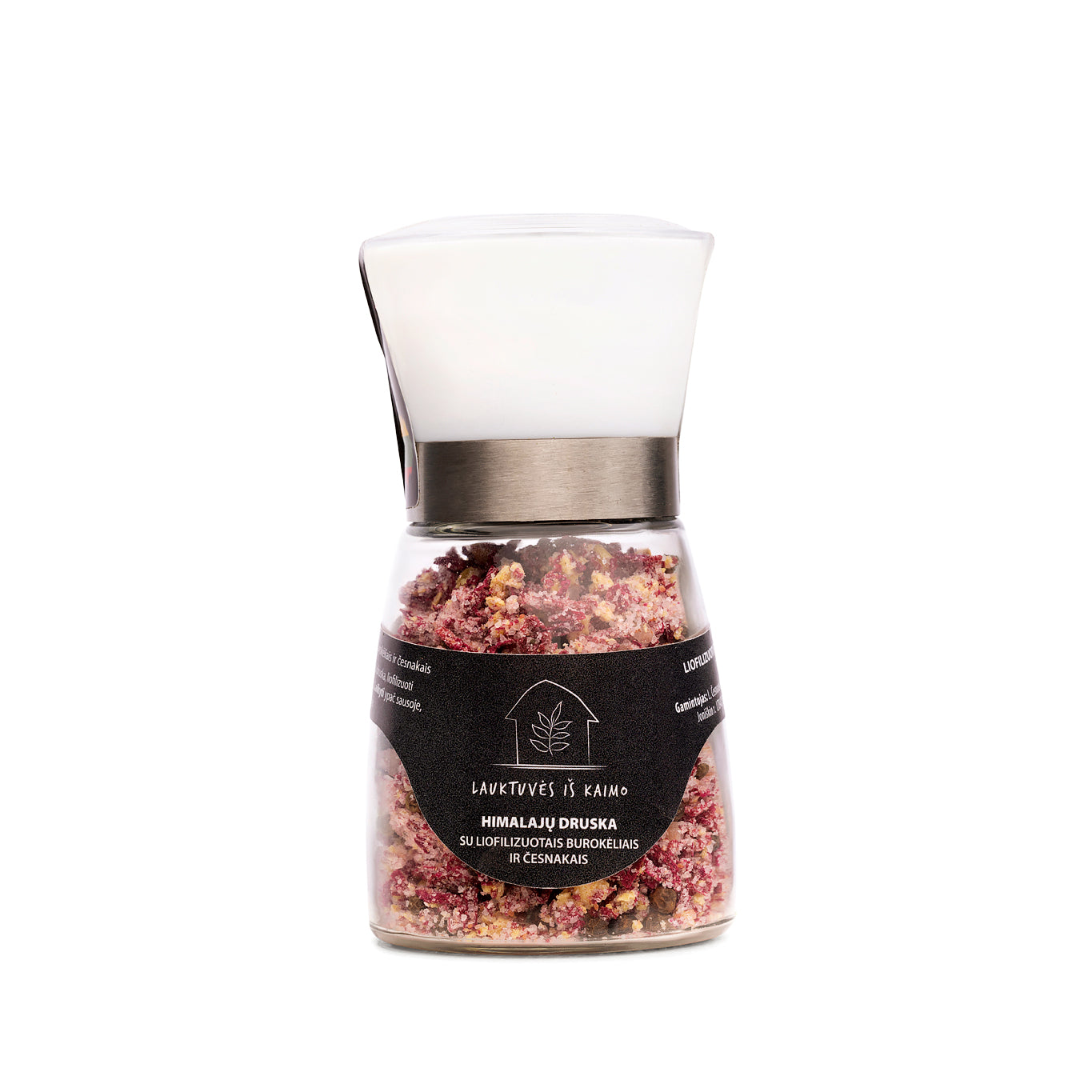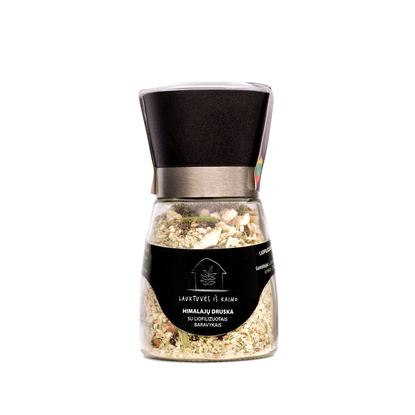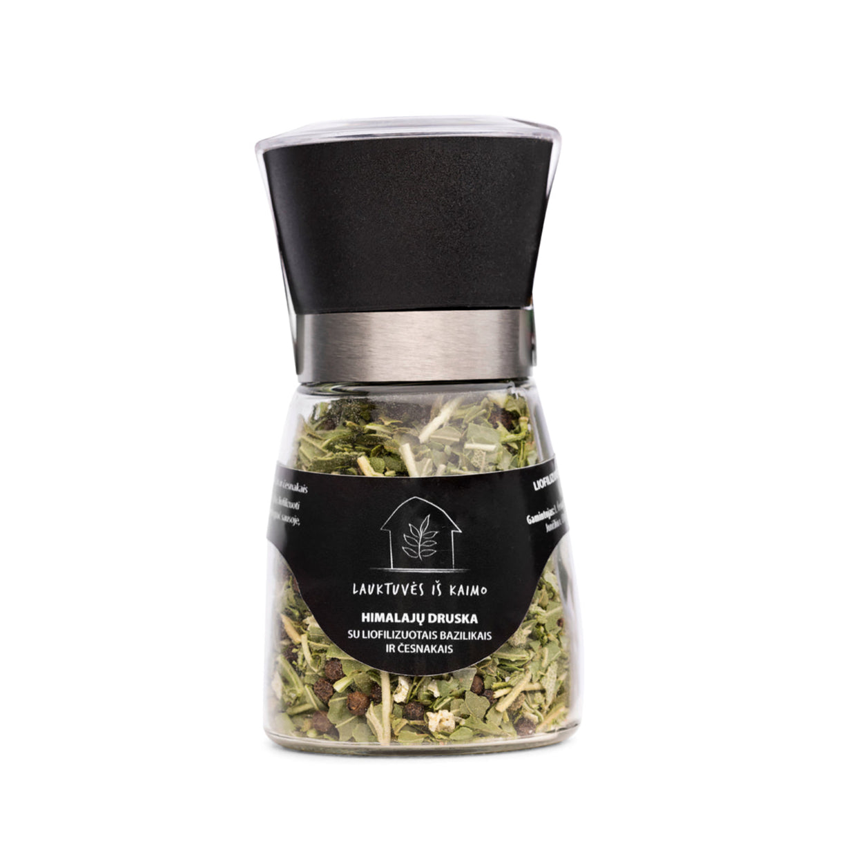Himalajų druska, juodieji pipirai, liofilizuotas bazilikas ir česnakas.