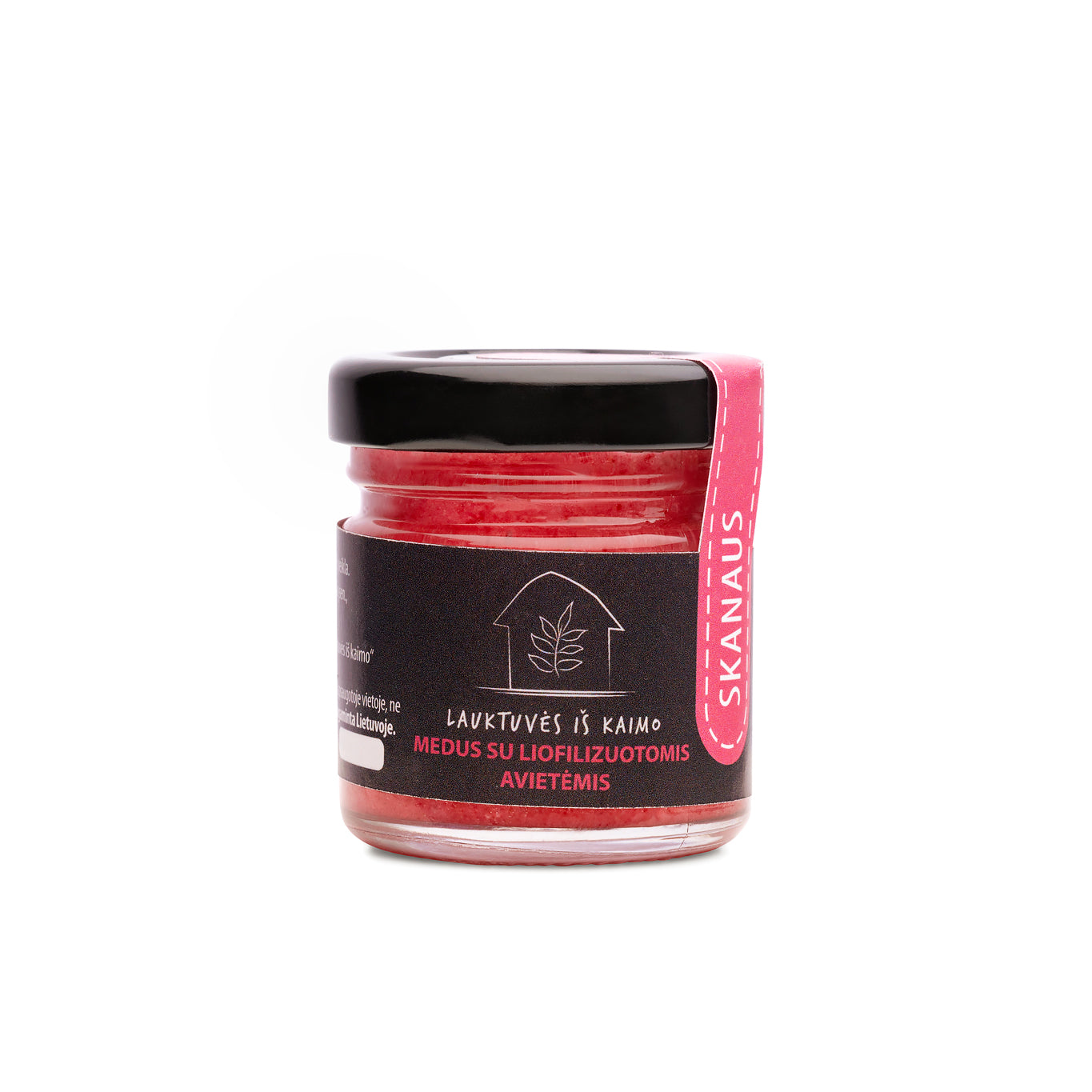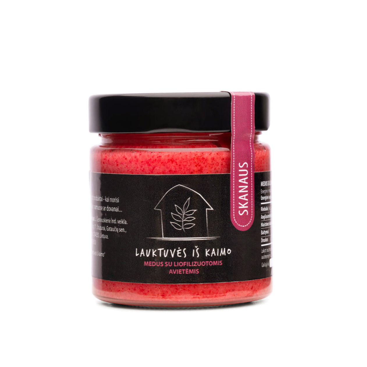 Sudėtis: 95proc. medus 5proc. liofilizuotos avietės