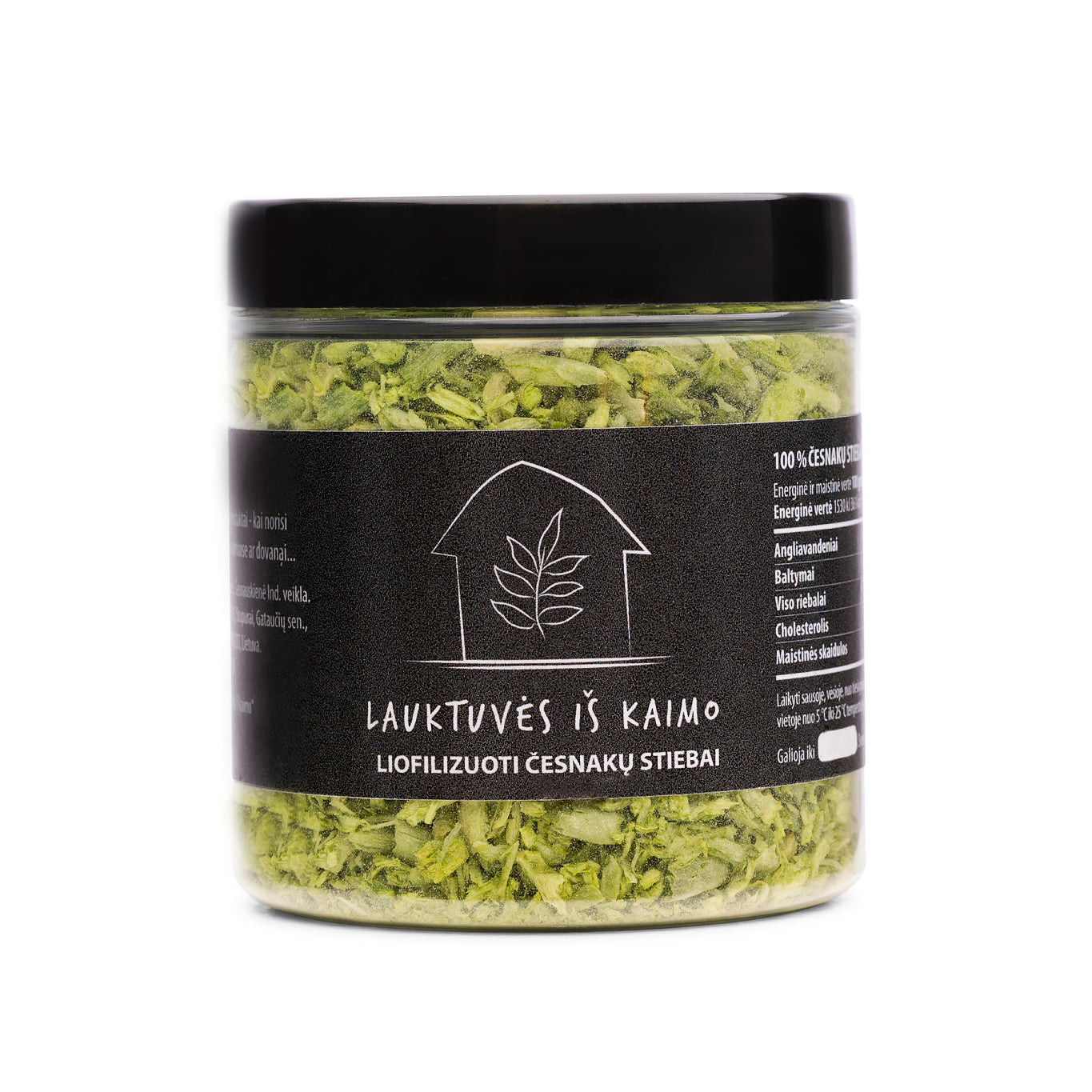 Praturtina patiekalus ne tik ryškiu skoniu, bet ir žalia spalva. Liofilizacijos proceso metu jie išlaiko visus savo natūralius vitaminus ir mineralus, todėl yra puikus pasirinkimas tiems, kas ieško sveikų priedų savo maistui. Šie stiebai – intensyviu česnako skoniu, puikiai dera su įvairiais patiekalais nuo sriubų, salotų, padažų bei troškinių.